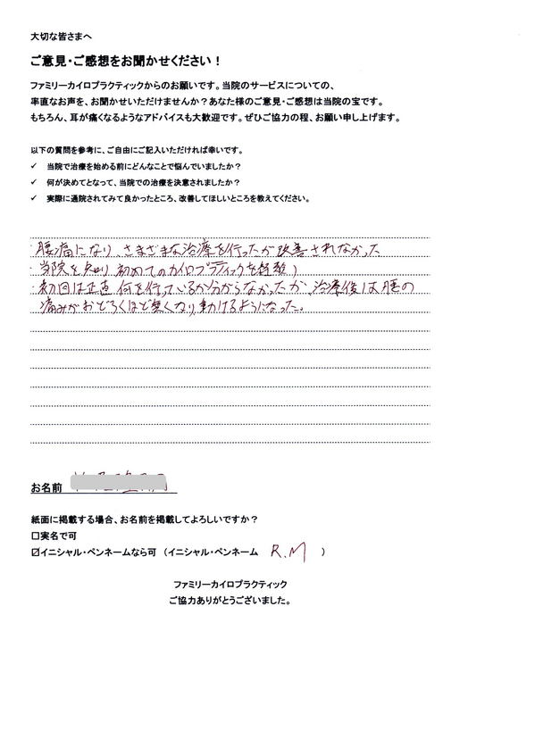 札幌市東区在住30代男性会社員のR・M様の腰痛の整体を受けた感想